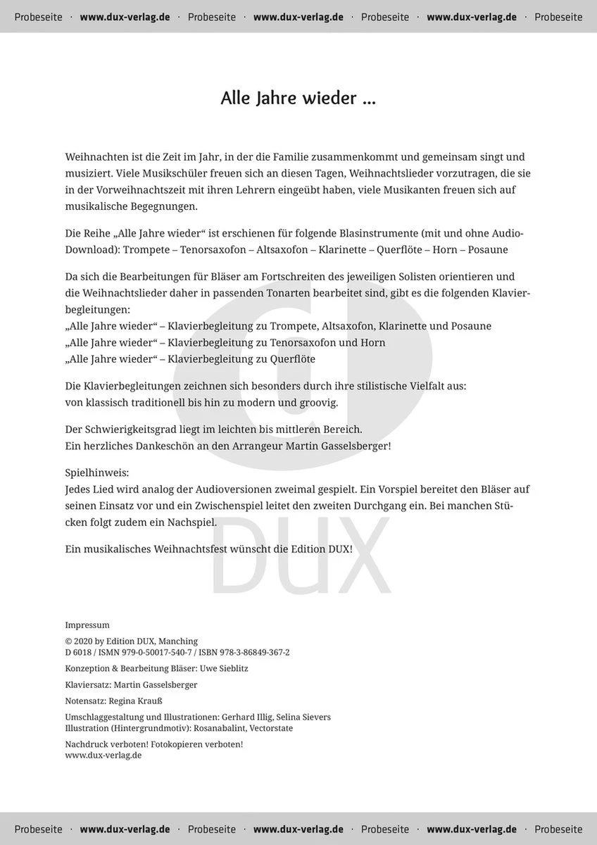 | Contenu de l'emballage | Edition Dux Alle Jahre wieder – Klavierbegleitung zu Trp/A-Sax/Klar/Pos – Livre de Noël pour instruments à clavier |