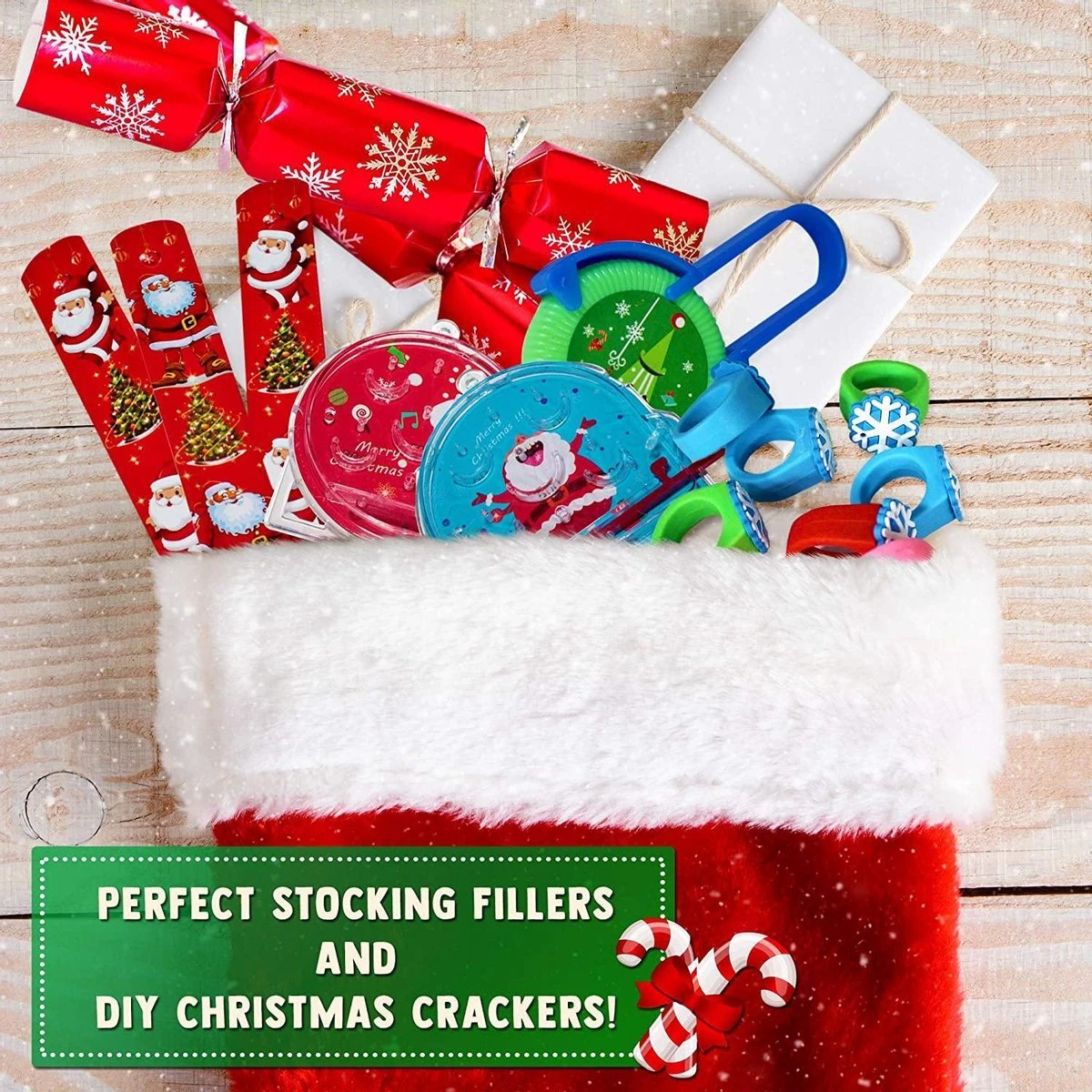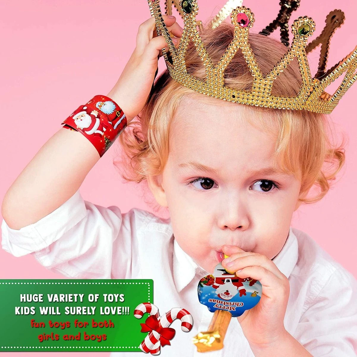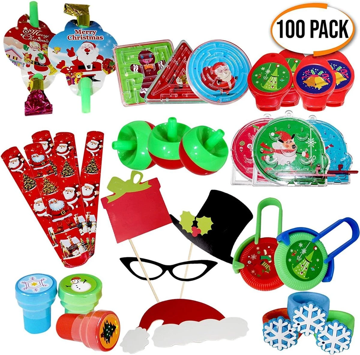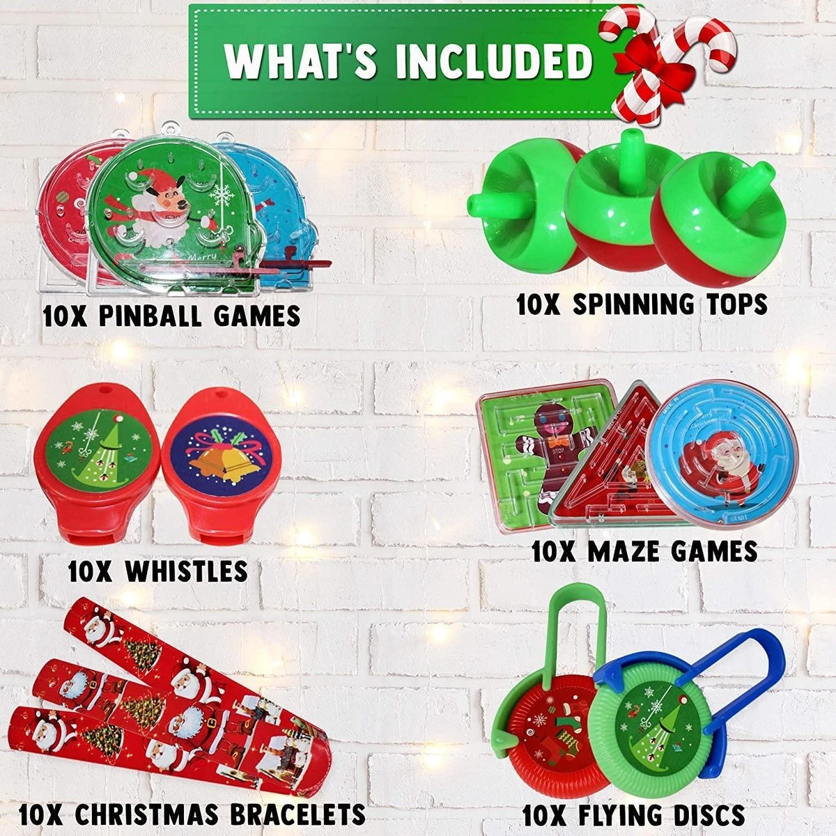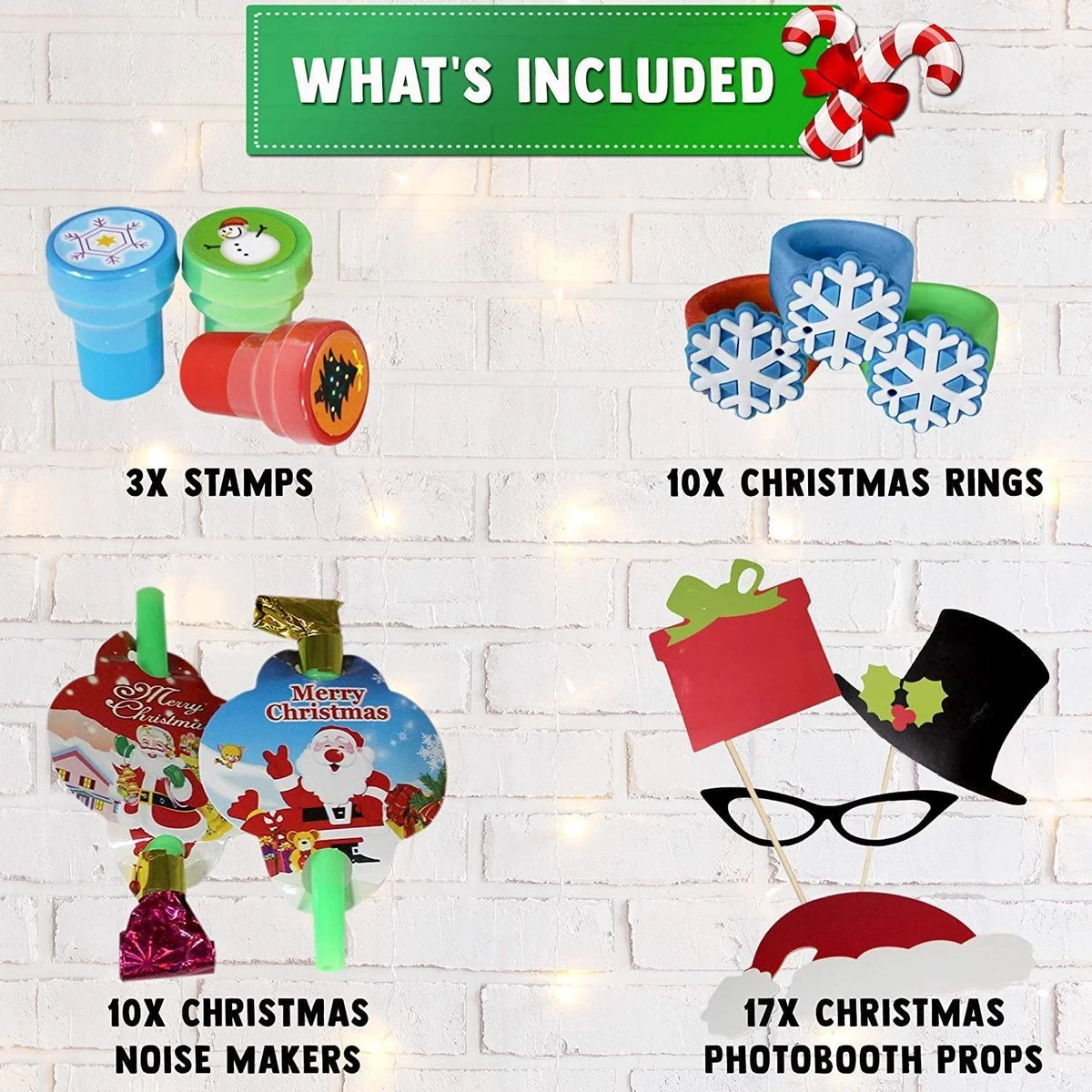 • Juste quelques idées – Notre forfait comprend des flippers sur le thème de Noël, des jeux de labyrinthe, des bracelets de Noël, des sifflets, des disques volants, des timbres de Noël, des jouets à souffler de Noël, des bagues, des toupies et des accessoires de photographie – un véritable coffre au trésor!