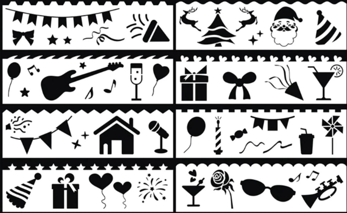 8 pochoirs bullet journal. Les modèles de bulletins vous aident avec le lettrage à la main et les illustrations de votre bullet journal. Pochoirs en plastique Bullet Journal – 8 pièces – Modèles – Fête – Fête – Fête – Cocktail – Musique – Vacances – Noël – Cadeau – Modèles – 5,5 x 18,3 cm – Boîte à outils de lettrage – Artisanat – Décoration – Accessoires de vêtements pour bébé