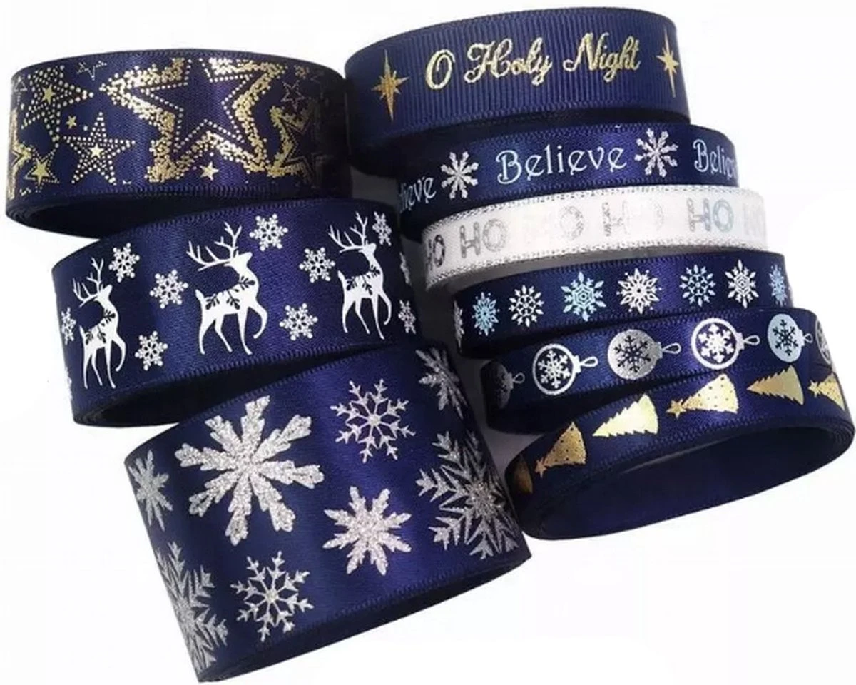 Ruban de Noël 22mm (2,2cm) | Ruban de satin de Luxe | Ruban de Noël Etoiles Poinsettia | Blauw Marine Or Brillant | ruban de décoration | Ruban de Tissus | Ruban cadeau | Rouleau : 10 mètres