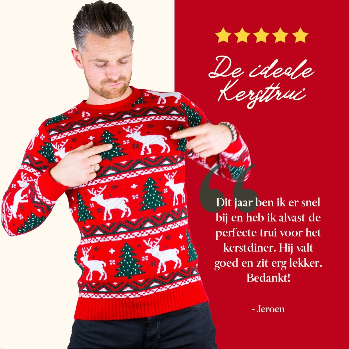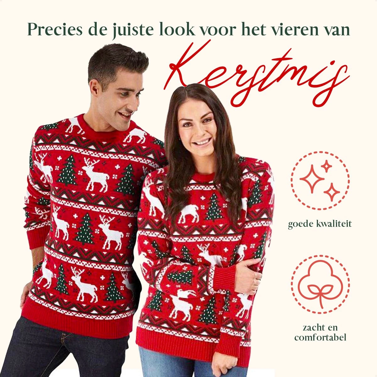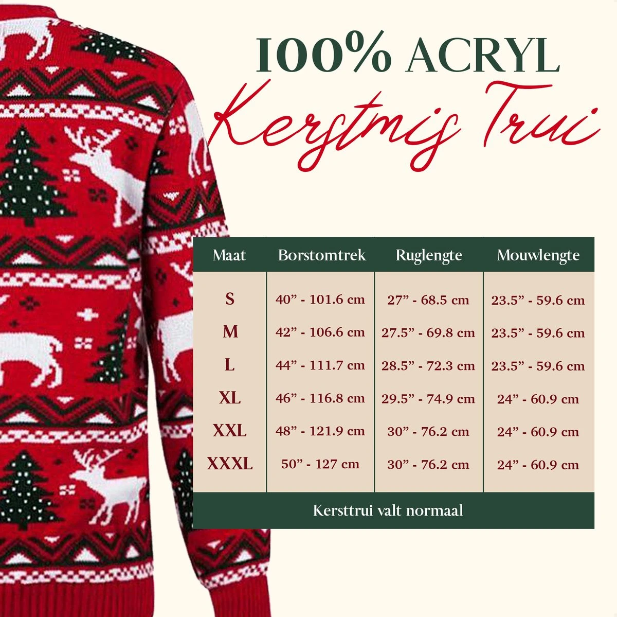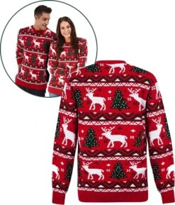 Grand pull de Noël pour hommes et femmes. Le pull est agréable et chaud et entièrement dans les couleurs traditionnelles de Noël avec l’imprimé assorti avec des rennes et des sapins de Noël. Ce chandail de Noël moche est également disponible pour les enfants, alors ce serait bien de porter le même chandail de Noël avec toute la famille. Le pull est fait de fil 100% acrylique et a une coupe régulière.