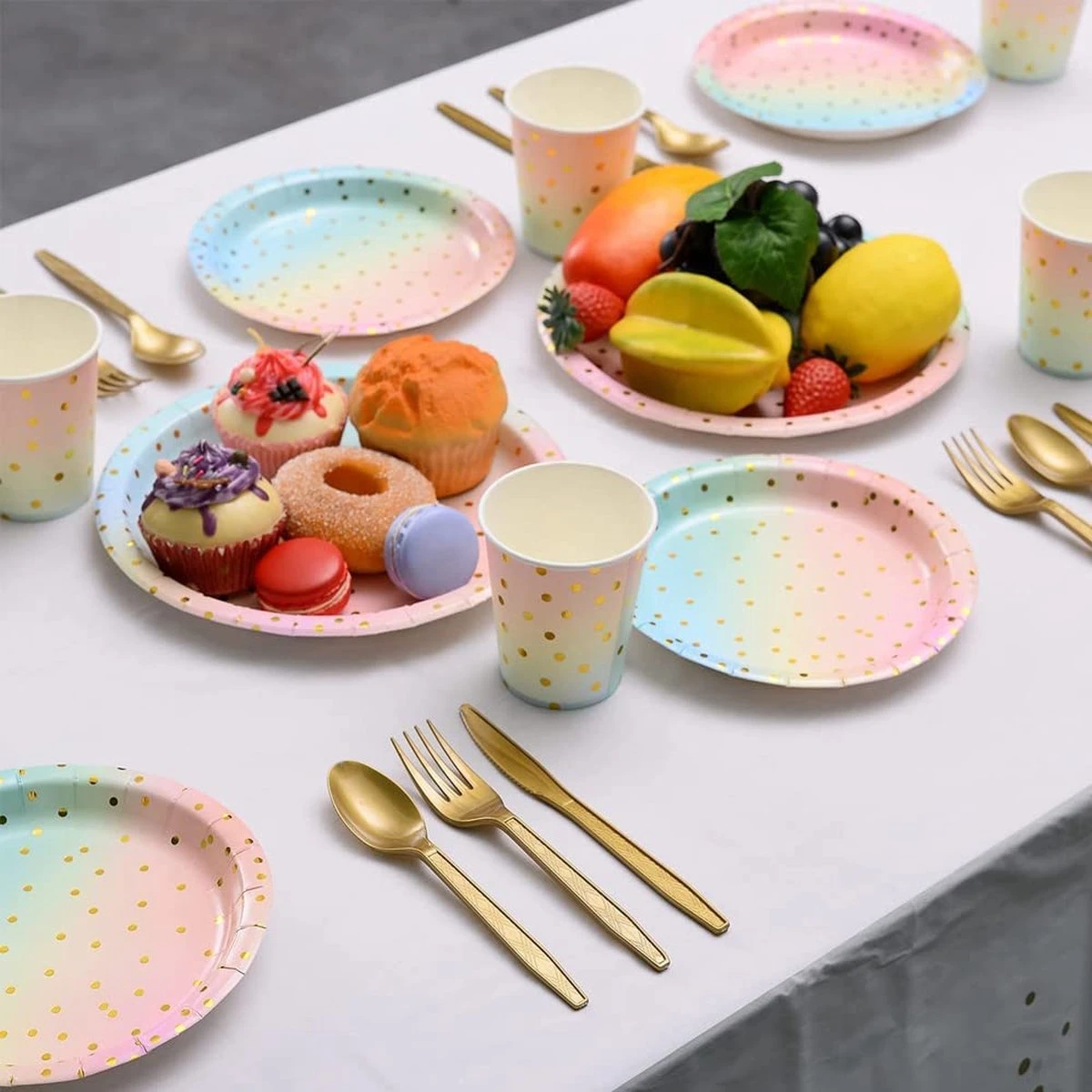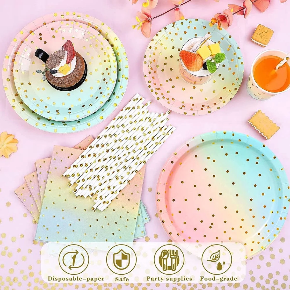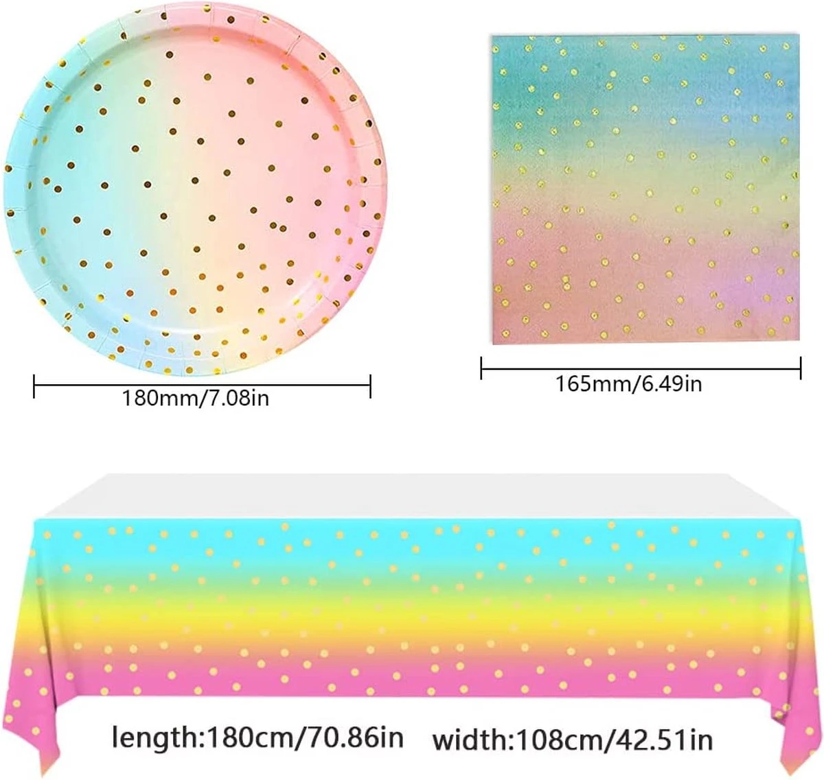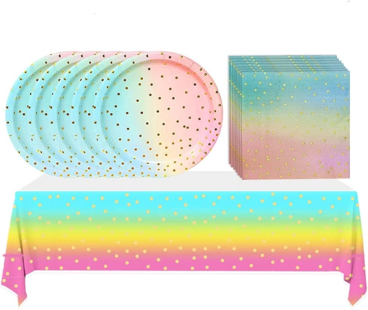 - Design Uniek : la vaisselle de fête arc-en-ciel est conçue avec une couleur dégradée, qui est très belle et élégante. Cet ensemble de vaisselle de fête peut ajouter du plaisir à votre fête, c’est une décoration de table parfaite pour les anniversaires ou autres célébrations. Le produit est biodégradable.